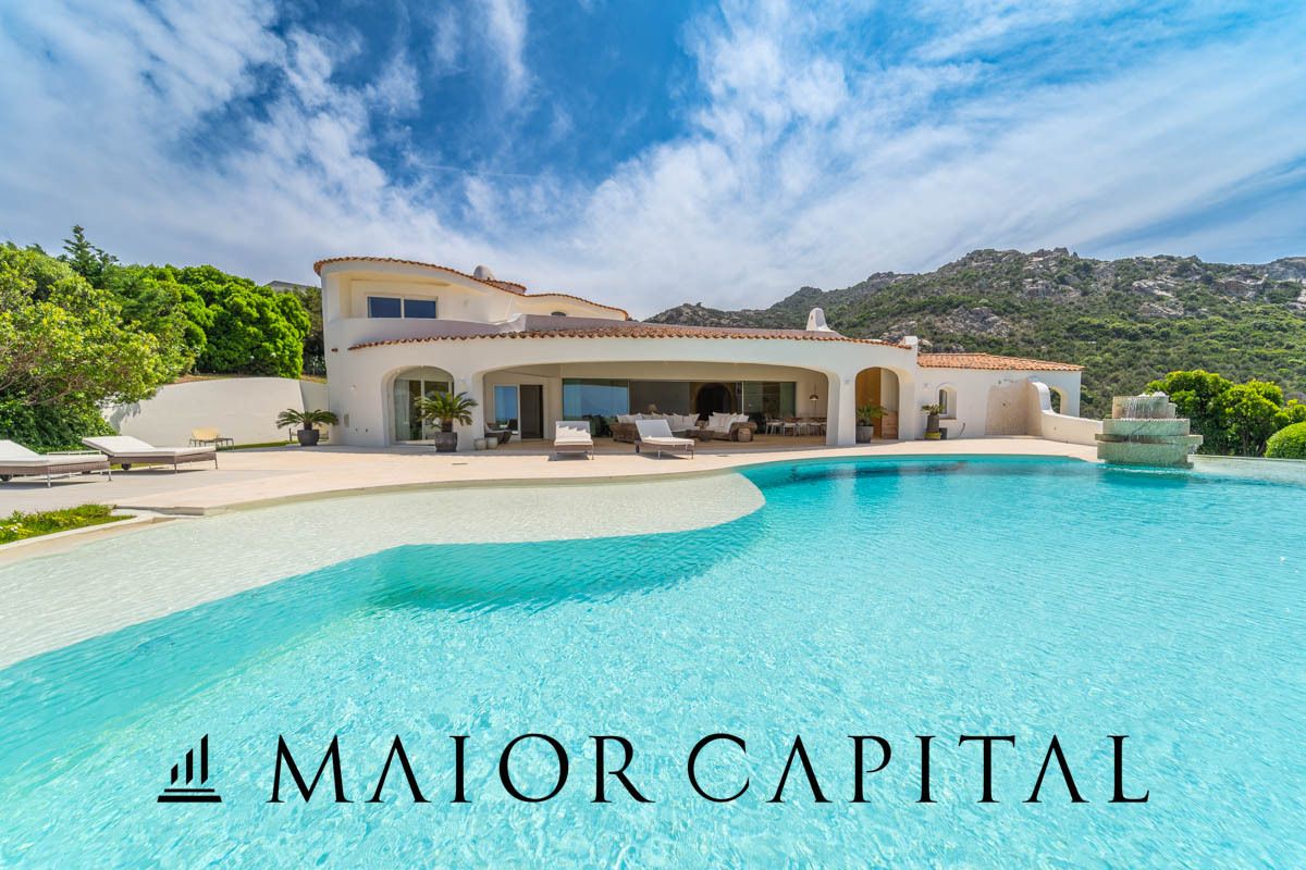 L'esterno della villa è altrettanto impressionante, con una meravigliosa piscina che si affaccia sul mare e un curato giardino da cui è possibile ammirare l’intera Porto Cervo.